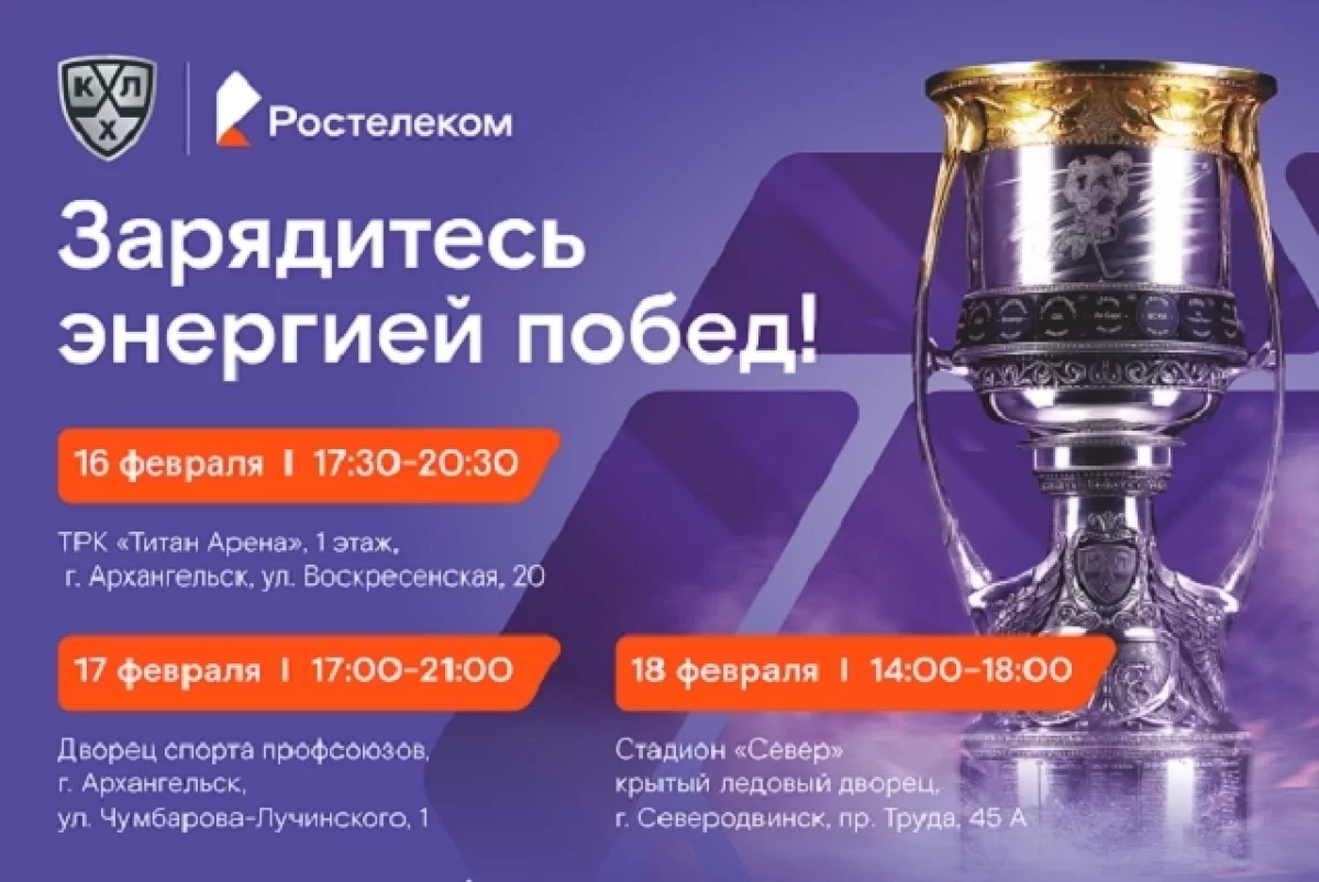 В Северодвинске, на арене нового ледового дворца трофей будут встречать 18 февраля. Кроме экспонирования Кубка здесь запланирована обширная программа — от квизов на спортивную тематику до товарищеского матча и мастер-класса от Сергея Андронова.